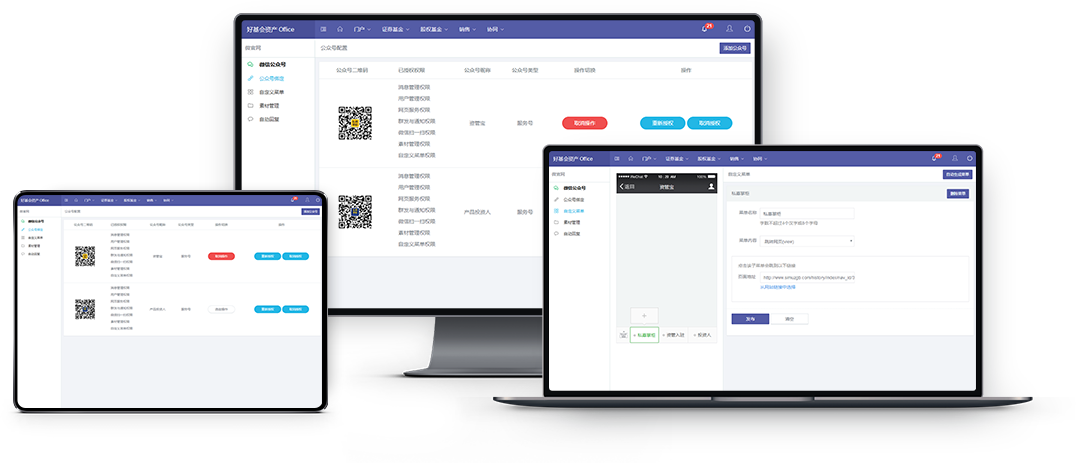 多公众号绑定与管理系统无限绑定公众号,并将公众号素材与网站同步,内容管理更轻松自如,粉丝同步、自定义菜单等功能,将网站、投资人、公众号深度融合管理。