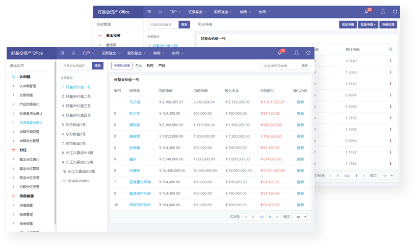 专注证券私募基金运作中的管理,包括基金档案管理、认购、申购、赎回、分红管理;信息披露包括报表、净值披露;投资者档案管理、账户管理;投资管理与产品业绩管理;合规管理包括产品分红、适当性披露、合规展现等功能。