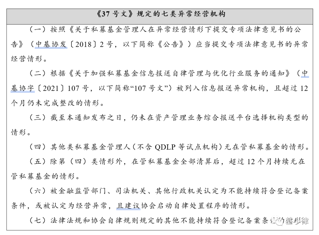2022年1月30日中基协发布《37号文》,该文规定了私募基金管理人的七种异常经营情形,具体如下: