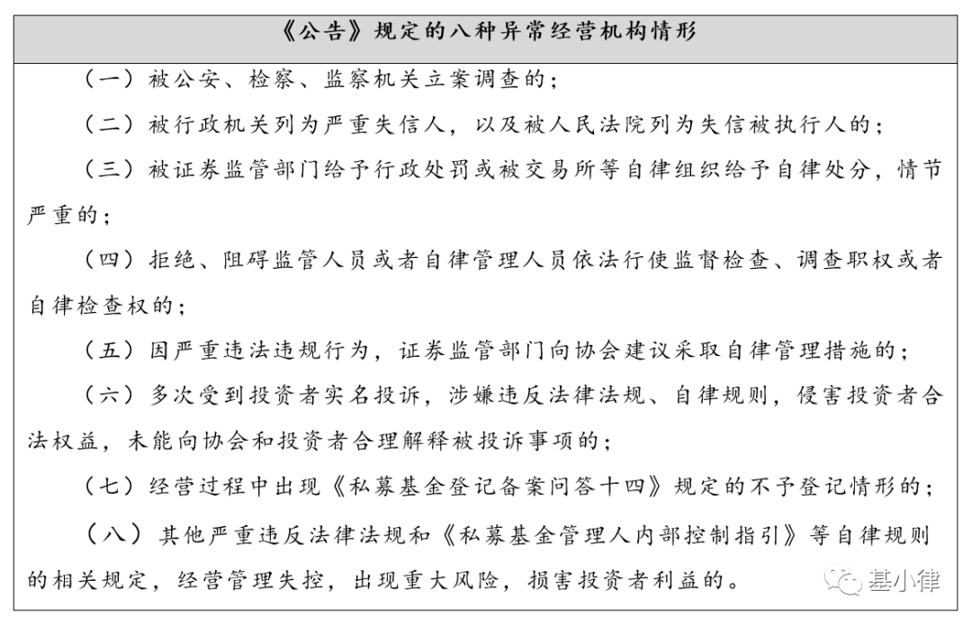 中基协此前最早在2018年3月就发布了《公告》,首次提及私募基金管理人的异常经营情形,并要求该类机构聘请律师事务所出具专项法律意见书,不然将面临管理人资格的注销。此处的异常经营机构情形包括如下几种情形: