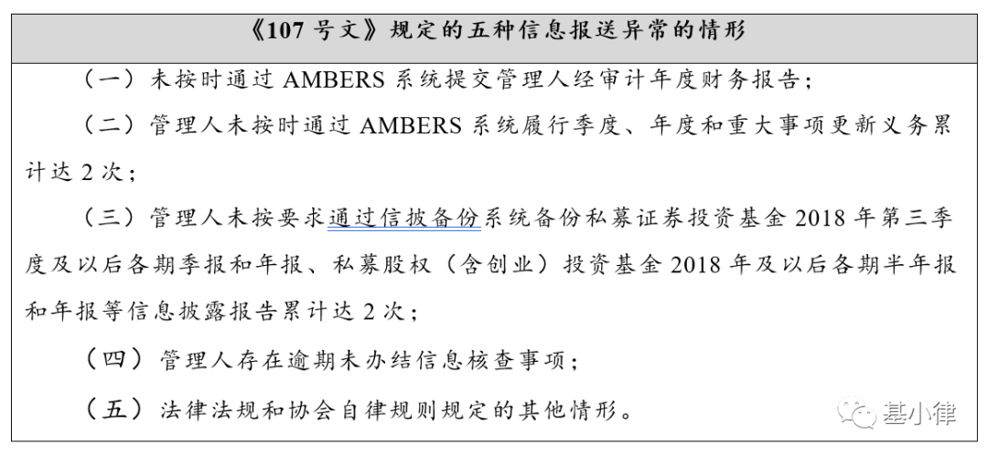 实践中部分管理人并不重视信息报送异常提示,乃至在收到异常经营通知时也不关注具体信息而是当做信息报送异常提示将之放置不予处理。根据107号文,管理人一旦被列入信息报送异常机构,须自整改完毕之日起六个月后方可取消公示。为体现差异化管理,中基协将同步在Ambers系统上公示管理人信息报送异常的具体事项以及整改情况。如管理人未在3个月的整改期限内完成整改的,被公示异常经营的机构会影响后续业务的开展,并需要在前述期限内出具专项法律意见书。