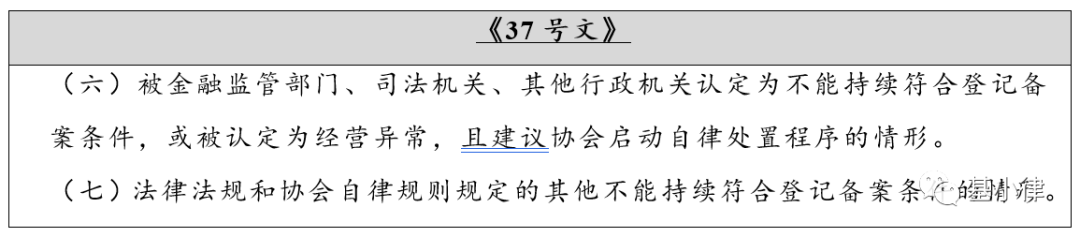 根据《37号文》的第(六)条和第(七)条所述情形,主要规定的是私募管理人被其他监管机构或者法律规定认定不能持续符合登记条件或异常经营,主要包括以下两种情形:
