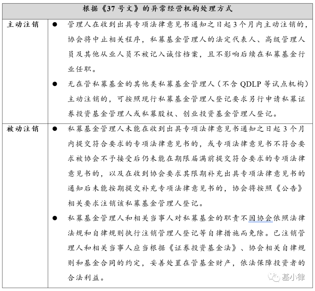 而对于未按时整改提交专项意见书的私募管理人,中基协也会区分他们的行动而采取不同的处理态度,具体分为主动注销或者被动注销两种情形: